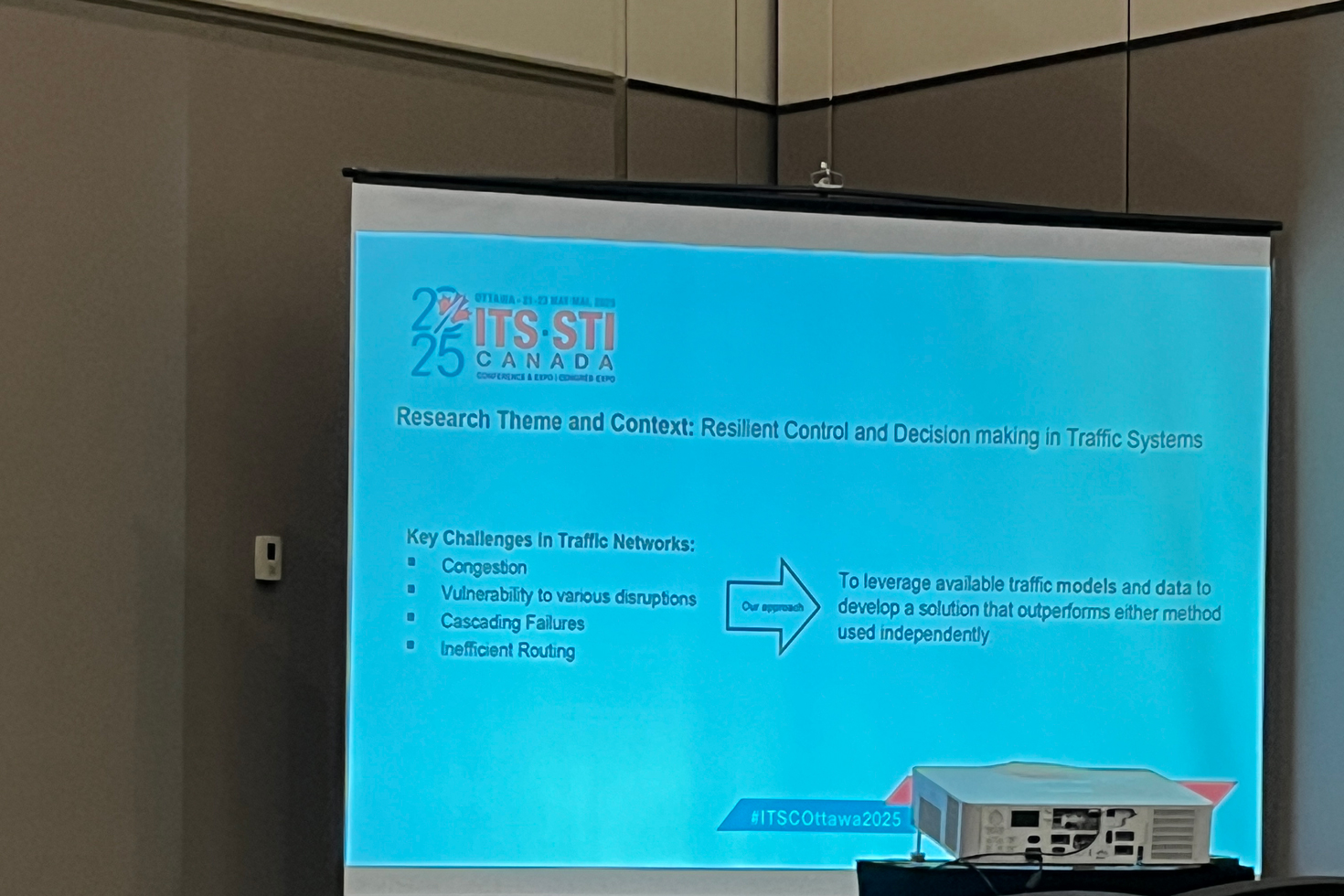 On May 23rd, co-founder Professor Mohammad Pirani presented "Advancing Urban Traffic Control Through Structured System-Theoretic Frameworks." The talk covered how systems and control theory addresses challenges that current traffic management methods cannot solve. Rather than treating each intersection as an isolated unit, the framework treats the traffic network as a connected system where signals share information and optimize collectively. This is the core technical idea behind ROASYS, and presenting it at ITS Canada placed it directly into the conversation shaping Canadian intelligent transportation.